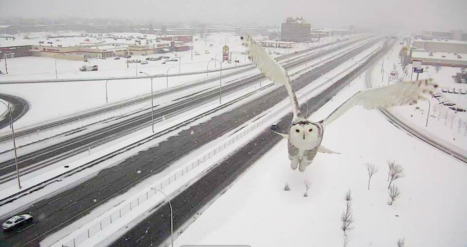 Дорожной камере в Канаде удалась съемка, ради которой профессиональные фотографы дикой природы тратят годы. Министр транспорта канадской провинции Квебек Роберт Поети поделился с пользователями социальных сетей удивительными кадрами, снятыми автоматической дорожной камерой, на которых с очень близкого расстояния запечатлена любопытная сова, пролетающая над пригородной трассой. Роберт Поети пояснил, что: «Великолепная полярная сова попала в объектив камеры на трассе А-40 к западу от Монреаля» По словам директора Лаборатории наблюдения за птицами Барабары Фрей, вероятнее всего, полярная сова попала в камеру, когда искала удобное место для посадки. «Я думаю, хайвеи особенно привлекательны для сов, потому что это большое открытое пространство, окруженное широкими полями, которое идеально подходит для охоты на мелких грызунов. Совам нравится использовать высокие столбы для временных остановок в ожидании идеального момента для охоты», — сказала госпожа Фрей в интервью CBC News.