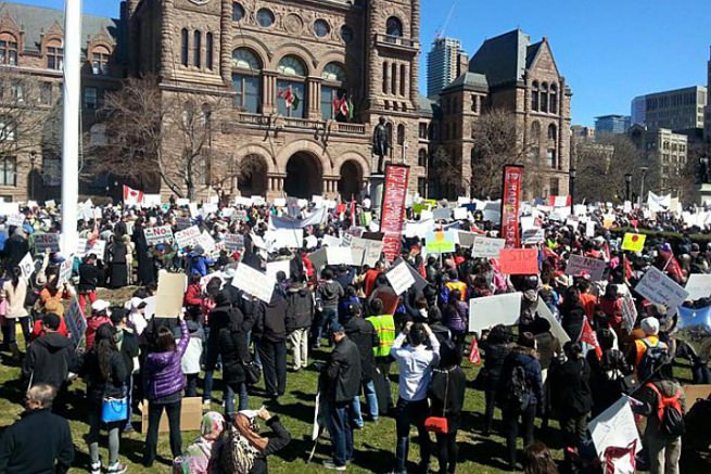 В апреле состоялся второй митинг, на который пришло уже 5000 человек. Люди приехали из разных городов Онтарио, организованно. Здесь были англосаксы, индийцы, русские, греки, китайцы, иммигранты из стран Африки… Организованнее всех, конечно, были мусульмане. “Наш дом в огне!” – так выразился их лидер.