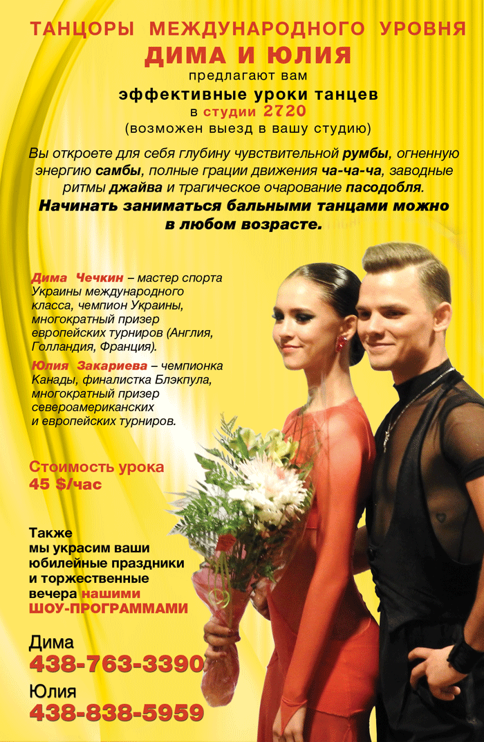 Танцоры международного уровня Дима и Юлия предлагают вам эффективные уроки танцев в студии 2720 (возможен выезд в вашу студию). Вы откроете для себя глубину чувствительной румбы, огненную энергию самбы, полные грации движения ча-ча-ча, заводные ритмы джайва и трагическое очарование пасодобля. Начинать заниматься бальными танцами можно в любом возрасте.