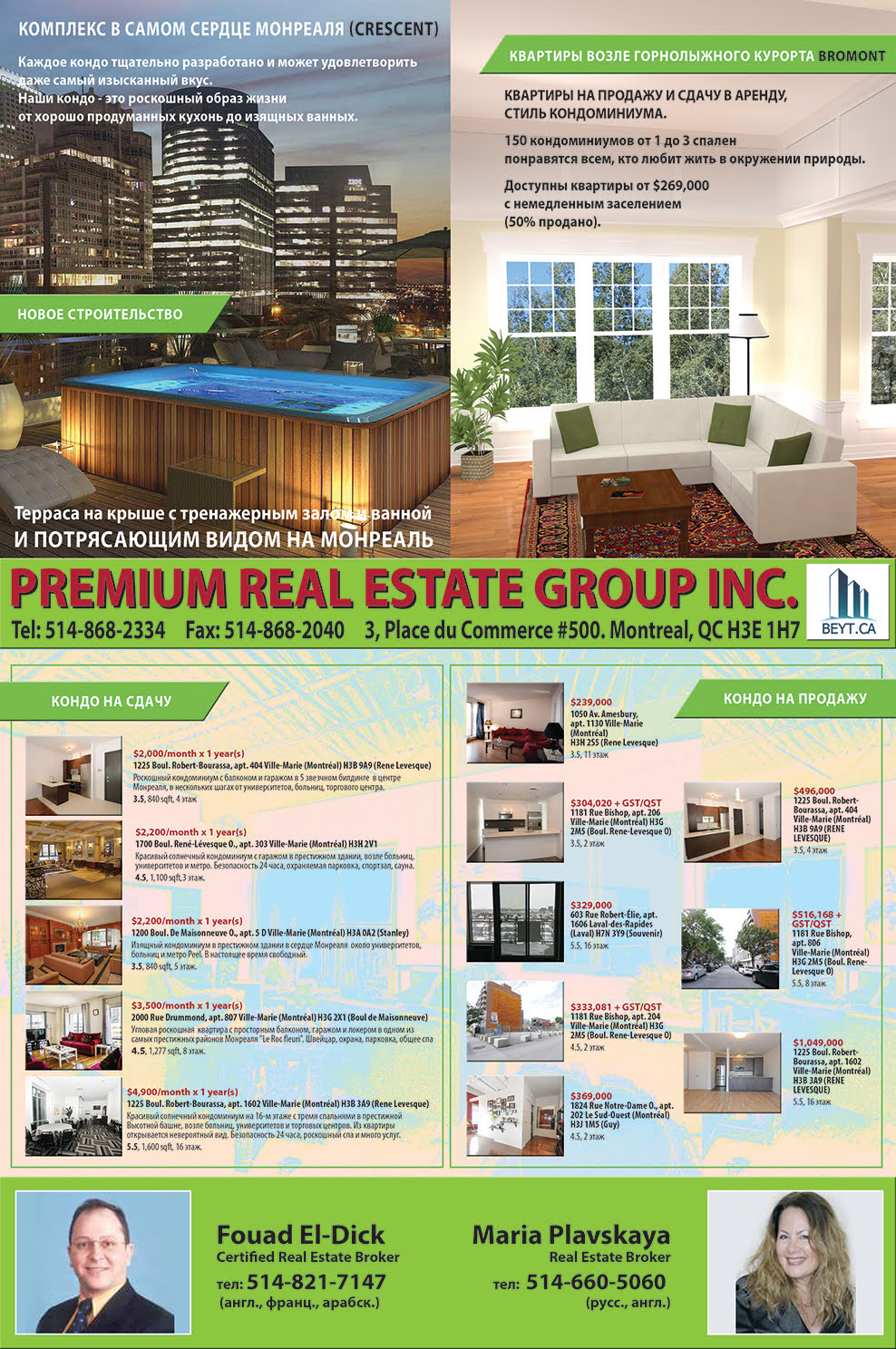 РекламаРеклама в активах Канадской Медиа ГруппыНовая компания на нашем сайте — Premium Real Estate Group Inc. by Svitlana MatviyenkoИюл 19, 2015Июл 28, 201503 Share0 Если Вы хотите жить в элитном месте в Монреале или за городом в окружении природы— звоните прямо сейчас 514-660-5060 — Мария Пожалуйста, оставьте это поле пустым. Подпишитесь на ежедневную рассылку новостей о Канаде, Квебеке и Монреале. Читайте актуальные новости каждый день. Не пропустите главные события! Проверьте ваш почтовый ящик или спам, чтобы подтвердить свою подписку.
