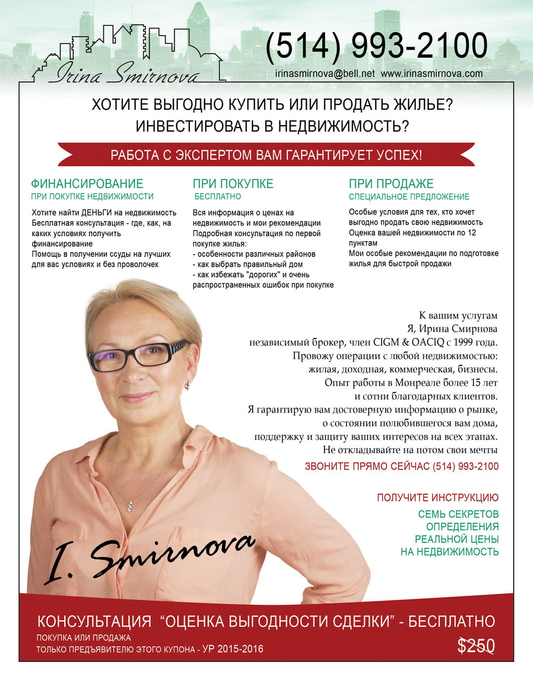 К вашим услугам Ирина Смирнова, независимый брокер, член С1СМ & 0АС10 с 1999 года .