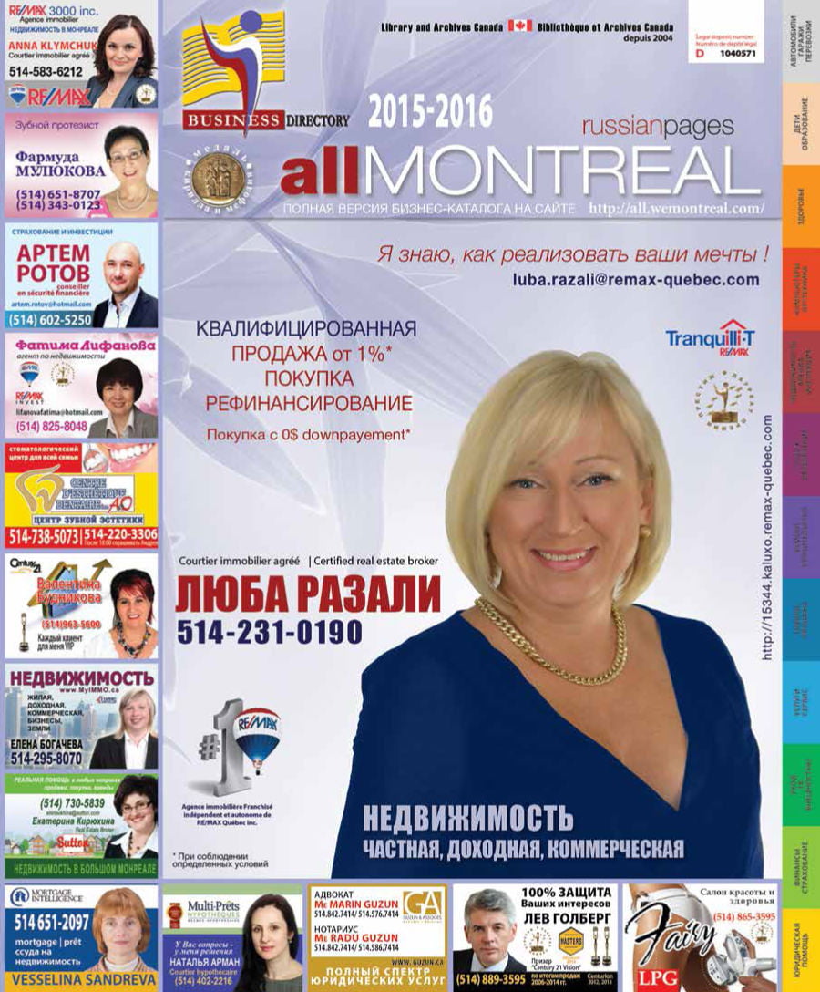 Бизнес-каталог ”Весь Монреаль-Русские страницы”, давно ставший постоянным источником информации для монреальцев, в 2014 году отметил 10-летний юбилей. 10 лет – это уже серьезный возраст, и пришло время обновить формат издания, чтобы сделать его еще более удобным, полезным и информативным. Новая версия выходит в новом цветном формате Бизнес Каталога, и сейчас она уже доступна онлайн во всех информационных источниках Канадской Медиа Группы и социальных сетях. Вас ждет новый формат, новые клиенты, а значит, лучшие результаты в бизнесе.