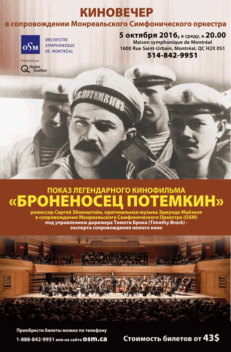 На монреальском показе нам предстоит не только вновь соприкоснуться с творчеством гениального Сергея Эйзенштена, австрийского композитора Эдмунда Мэйзеля, насладится высоким уровнем исполнения «Монреальского симфонического оркестра», но и ознакомиться с творчеством выдающегося американского дирижера Тимоти Брока, специалиста в оркестровом сопровождении немого кино. Вот такой симбиоз творчества гениев ожидает нас на следующей неделе.
