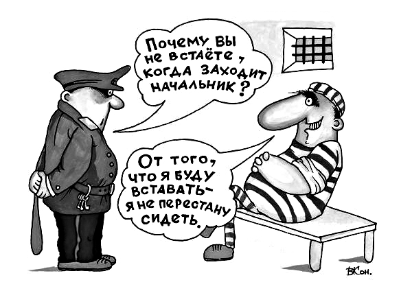 Приехала инспекция с проверкой в тюрьму. Ворота нараспашку, камеры открыты, собак — нет, охраны — нет!!! Все заключенные на месте. Начальник инспекции к начальнику тюрьмы: — Что вы сделали, что никто не сбегает, все на месте, охраны нет? — Провел Интернет.