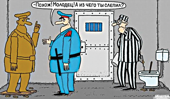 — А в этой камере сидит наша гордость, — сообщает начальник тюрьмы посетителям. — Когда он впервые попал к нам, он был неграмотным. Мы научили его писать и читать. Теперь сидит за подделку документов.
