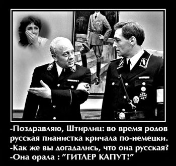 — Я всегда знал, что вы – русский шпион, Штирлиц, но не мог этого доказать. Но теперь я знаю, как вас проверить. Слава Украине, Штирлиц!