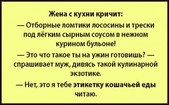 — О, сэр, какая у вас в доме великолепная посуда, подчеркивающая ваш утонченный аристократический вкус! Я восхищен! — Да, сэр, это уникальный китайский фарфор 17-го века. А вот эта неглубокая изящная чашка, которую я приобрел недавно на аукционе, мне особенно нравится! — И чем же, сэр? — Её очень удобно вылизывать после сметаны…