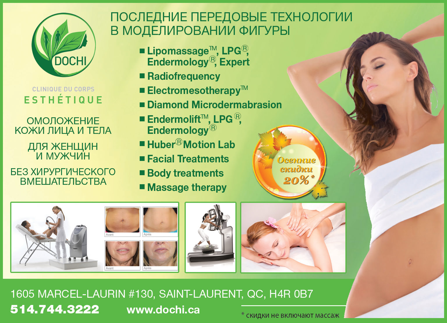 РекламаDOCHI- клиника тела и эстетики by Svitlana MatviyenkoСен 19, 2015Сен 17, 201500 Share0 DOCHI- это последние передовые технологии в моделировании фигуры. Омоложение Кожи лица и тела для Женщин и мужчин Без хирургического вмешательства 1605 Marcel-Laurin #130, Saint-Laurent, QC, H4R 0B7 514.744.3222 www.dochi.ca Пожалуйста, оставьте это поле пустым. Подпишитесь на ежедневную рассылку новостей о Канаде, Квебеке и Монреале. Читайте актуальные новости каждый день. Не пропустите главные события! Проверьте ваш почтовый ящик или спам, чтобы подтвердить свою подписку.