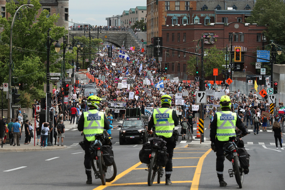 В толпе были замечены флаги Квебека с перевернутыми лилиями и плакаты, призывающие правительство вернуть свободу населению.