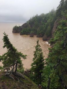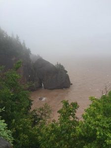 Продолжая путешествие по Атлантической Канаде, мы добрались до одной из знаменитых достопримечательностей Нью-Брансуика — так называемых «Хопвельских утесов» (Hopewell Rocks). Расположены они на территории заповедника и знамениты тем, что в заливе Фанди (Fundy), где они находятся, самые крутые в мире (!) приливы и отливы — разница между приливом и отливом может достигать 18 метров! Это происходит благодаря вытянутой форме залива, при постепенно уменьшающейся ширине и глубине. То есть, например, к шести часам утра океан стремительно (минут за 15-20 — реально видно изменение уровня воды) уходит из залива и можно гулять по дну океана, наблюдая постоянно сменяющуюся картину подводной жизни, оказавшейся на суше, затем через пару часов точно так же стремительно океан возвращается в залив и затопляет скалы, а часам к семи вечера начинается новый отлив — и снова можно гулять в заливе Фанди по дну океана. Когда мы приехали в Фанди, был прилив, и к тому же сильный ливень, но мы не смогли отказать себе в удовольствии дойти до Hopewell Rocks и хотя бы сделать пару фотографий.