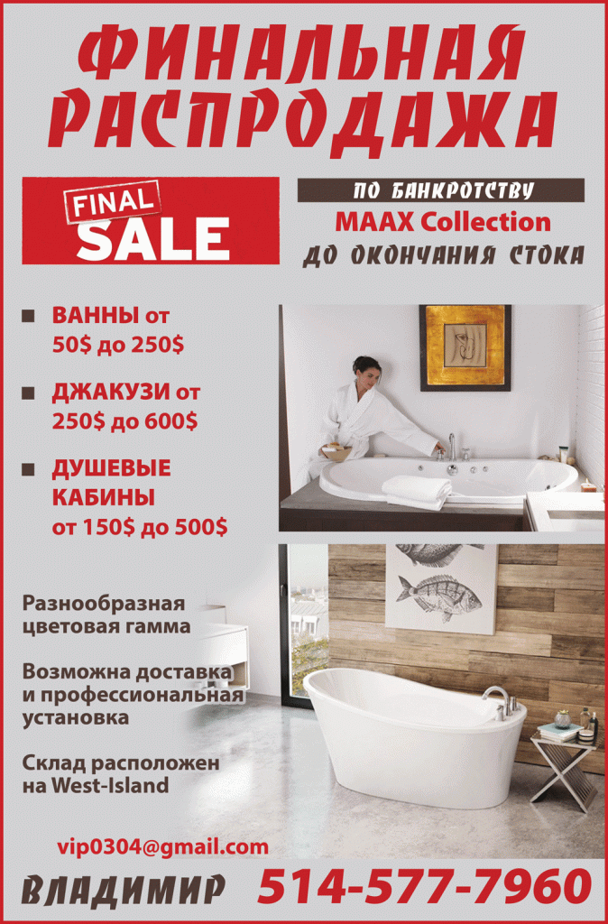 РекламаФинальная распродажа по банкротству MAAX Collection до окончания стока. by Svitlana MatviyenkoФев 22, 2017Фев 17, 201700 Share0 Ванны от 50$ до 250$ Джакузи от 250$ до 600$ Душевые кабины от 150$ до 500$ Разнообразная цветовая гамма Возможна доставка и профессиональная установка Склад расположен на West-Island Владимир 514-577-7960 [email protected] Пожалуйста, оставьте это поле пустым. Подпишитесь на ежедневную рассылку новостей о Канаде, Квебеке и Монреале. Читайте актуальные новости каждый день. Не пропустите главные события! Проверьте ваш почтовый ящик или спам, чтобы подтвердить свою подписку.