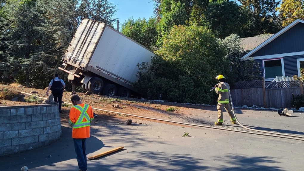 Грузовик и его прицеп, принадлежащие компании Coastal Pacific Xpress из Суррея, Британская Колумбия, все еще оставались внутри дома во вторник утром. По словам соседа, в дом просачивается дизельное топливо.