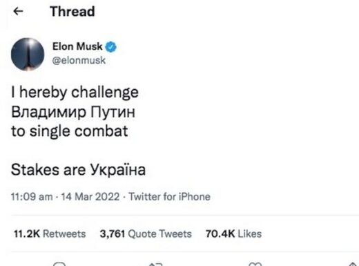 «Я бросаю вызов Владимиру Путину. Поединок один на один. Ставка — Украина», — заявил Маск.