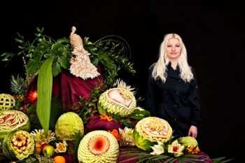 Меня зовут Алена Стежар и я занимаюсь карвингом. Это художественная резьба по овощам и фруктам. Также я собираю букеты из фруктов, овощей, колбас, сыров.