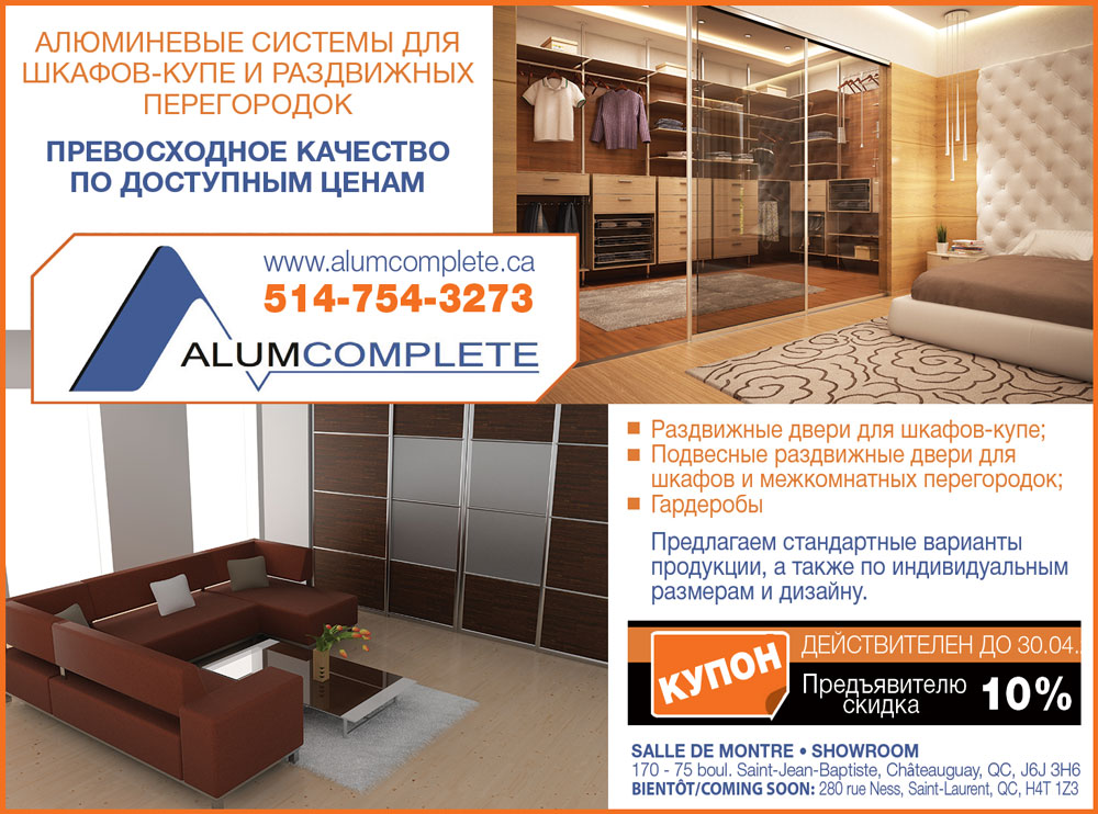 У нас в гостях НАДЕЖДА АНИНА, владелица и руководитель компании Alumcomplete Corporation Inc. Компания предлагает новые для Канады технологические решения, производит уникальные продукты, является дистрибьютером комплектующих для шкафов-купе и другой мебели. Компания постоянно отслеживает последние мировые тенденции на мебельном рынке, ведет активную работу по разработке и выведению новинок на рынок Канады. Об этом и о себе Надежда рассказала нашему корреспонденту Денису Данкофф.