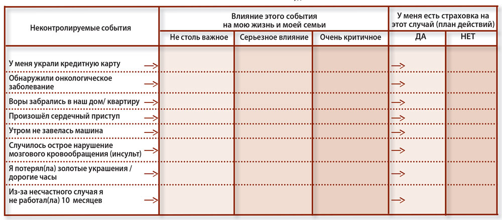 Просмотрите эти события указаные в левой колонке. Затем ответить себе на вопрос, на сколько то или иное событие может повлиять на качество вашей жизни и вашей семьи — средняя колонка. И задумайтесь, имеете ли Вы страховку или план действий на этот случай — последняя колонка. Желаю Вам удачи !