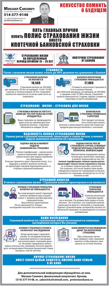 АвторыАндрей ИришкинСтрахованиеИскусство помнить о будущем. Михаил Сакович – финансовый консультант и независимый брокер. Пять главных причин купить полис страхования жизни вместо ипотечной банковской страховки. by Svitlana MatviyenkoИюл 19, 2018Июл 20, 201800 Share0 [tie_full_img][/tie_full_img] Пожалуйста, оставьте это поле пустым. Подпишитесь на ежедневную рассылку новостей о Канаде, Квебеке и Монреале. Читайте актуальные новости каждый день. Не пропустите главные события! Проверьте ваш почтовый ящик или спам, чтобы подтвердить свою подписку.