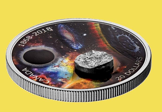 В ознаменование 150-летия Королевского Астрономического общества Канады (Royal Astronomical Society of Canada — RASC) сразу два дизайнера — Александра Рефорт, отвечавшая за реверс, и Сюзанна Блант, оформившая аверс, создали монету из чистого на 99.99% серебра, в которую действително вкраплен кусочек упавшего на Землю небесного тела.