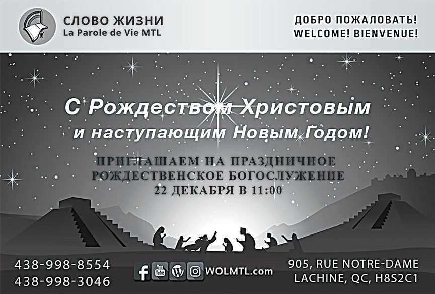 Приглашаю тебя на “Праздничное Рождественское Богослужение ”, которое пройдет в стенах нашей церкви, 22 декабря с 11.00 по 13.00, по адресу: 905, rue Note-Dame, Lachine, H8S 2C1, Qc.
