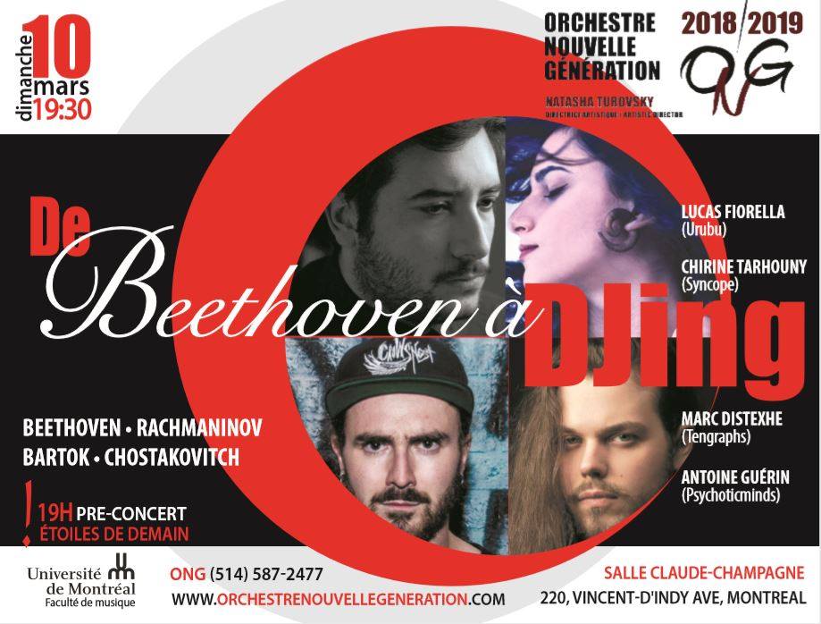 Любите необычные музыкальные сочетания? А как на счет микса классики и электронной музыки? Оркестр Новое Поколение (Orchestre Nouvelle Génération — ONG) подготовил оригинальную программу, в которой будут органично переплетаться два этих, казалось бы, таких разных музыкальных направления. 4 Ди-джея и композитора — TENGRAPHS, PSYCHOTIC MINDS, SYNCOPE и URUBU – составят компанию музыкантам Оркестра в ходе этого нетривиального концерта. Сначала вы услышите Рахманинова, Бетховена, Бартока, Шостаковича в новой интерпретации, а после окончания концерта зал превратится в ночной клуб, где состоится яркая вечеринка для всех, кто пожелает продолжить вечер. Итак, 10 марта, 19.30, Salle Claude Champagne, 220, avenue Vincent-d’Indy Montréal, H2V 2T2.