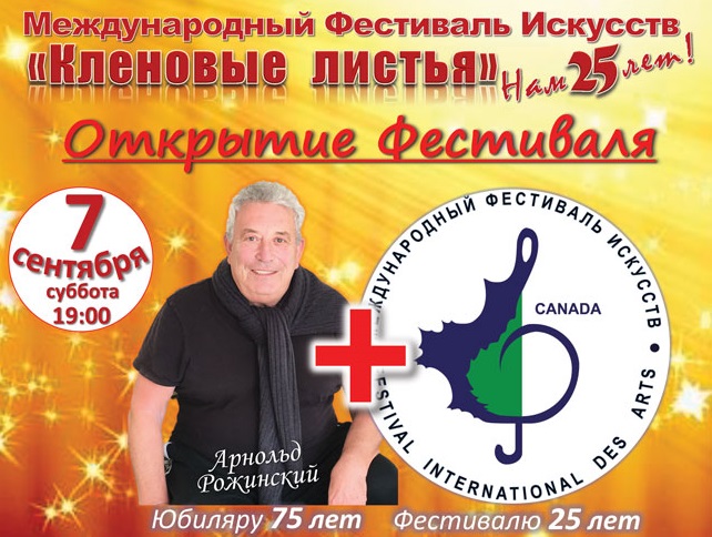 Не забудьте, что 7 сентября открывается фестиваль «Кленовые листья». В этот день состоится юбилейный Гала-концерт «100 лет вместе: Президенту фестиваля Арнольду Рожинскому 75 + фестивалю 25». В программе: