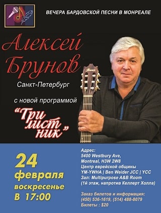 Концерт Алексея Брунова – исполнителя, известного тонким, интеллигентным вкусом, тщательностью расстановки акцентов и задушевной интонацией, состоится в Монреале 24 февраля. Вас ждёт встреча с высокой поэзией Б. Пастернака, А. Тарковского, Н. Рубцова, Ю. Левитанского, П. Вегина, М. Щербакова и других поэтов, положенной на музыку Сергея Труханова и Андрея Крючкова.