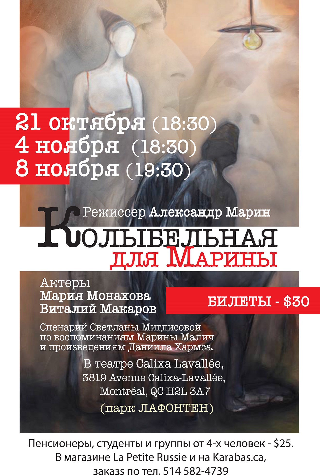 4 и 8 ноября монреальские зрители увидят спектакль-фантазию «Колыбельная для Марины». Он был создан на основе воспоминаний Марины Малич — последней жены писателя, поэта и философа Даниила Хармса. В тексте пьесы, написанной Светланой Мигдисовой, использованы его произведения. Режиссер — Александр Марин (театр им. О.П. Табакова, Москва). В спектакле заняты актеры театра и кино Мария Монахова и Виталий Макаров, известные в Монреале по своим работам в спектаклях монреальского театра Deuxième Réalité и др. Билеты можно приобрести в магазине La Petite Russie или заказать на страничке спектакля в facebook. Вечер состоится в Théatre Calixa Lavallée, 3819 Avenue Calixa-Lavallée, Montréal, QC H2L 3A7.
