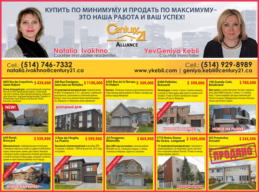 НедвижимостьРекламаКупить по минимуму и продать по максимуму–это наша работа и ваш успех! Natalia Ivakhno. YevGeniya Kebli. by Svitlana MatviyenkoАпр 5, 2017Мар 30, 201703 Share0 ►Natalia Ivakhno – Courtier immobilier résidentiel. Cell.: (514) 746-7332 [email protected] ►YevGeniya Kebli – Courtier immobilier Cell.: (514) 929-8989 www.ykebli.com [email protected] Пожалуйста, оставьте это поле пустым. Подпишитесь на ежедневную рассылку новостей о Канаде, Квебеке и Монреале. Читайте актуальные новости каждый день. Не пропустите главные события! Проверьте ваш почтовый ящик или спам, чтобы подтвердить свою подписку.