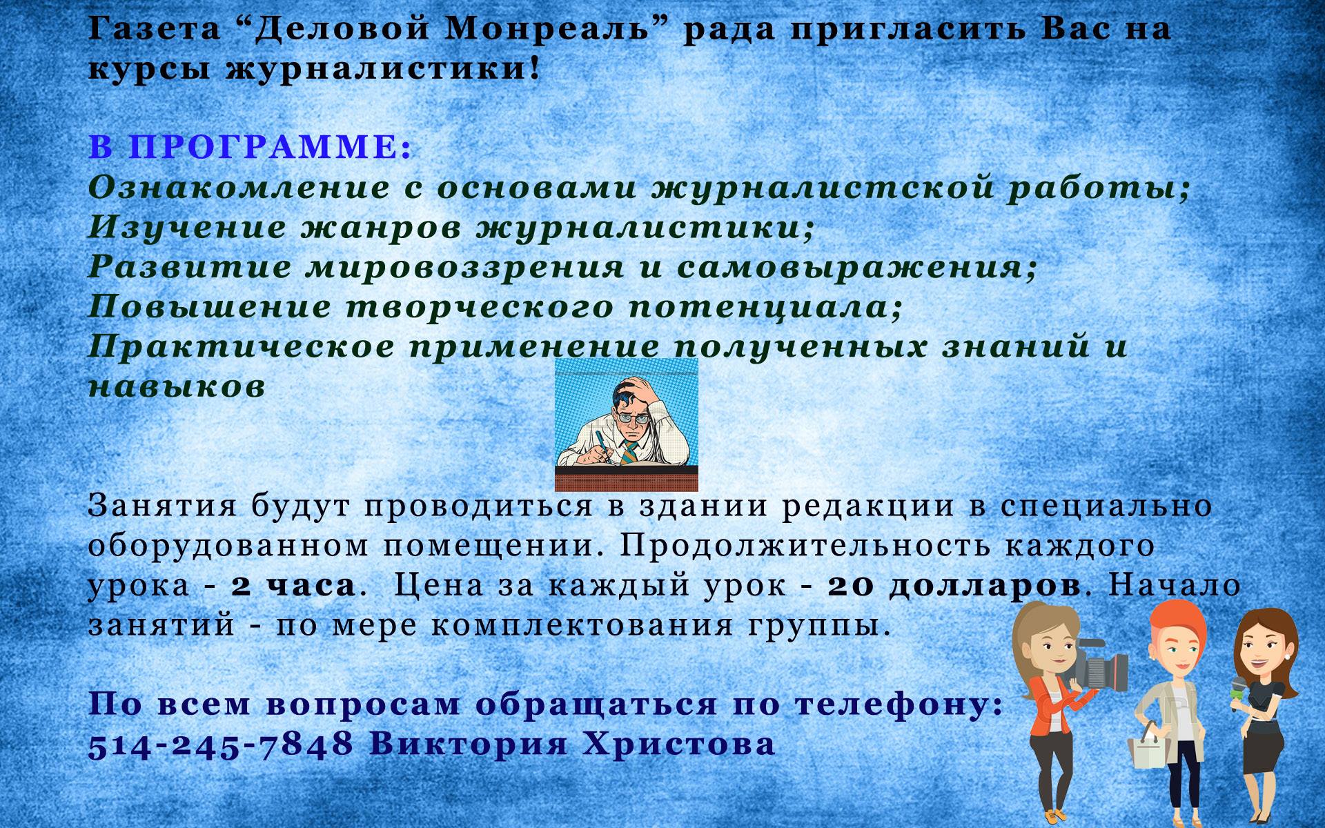 В понедельник в 11 утра в здании нашей редакции по адресу 5120 Trans Island Y3W2Z9 (две минуты пешком от станции метро Snowdon) стартуют курсы журналистики для всех желающих.