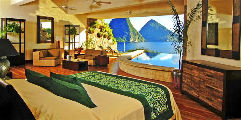 Это отель, расположенный на крутом склоне горы, таким образом, что из любого номера можно видеть и море и Питонов.