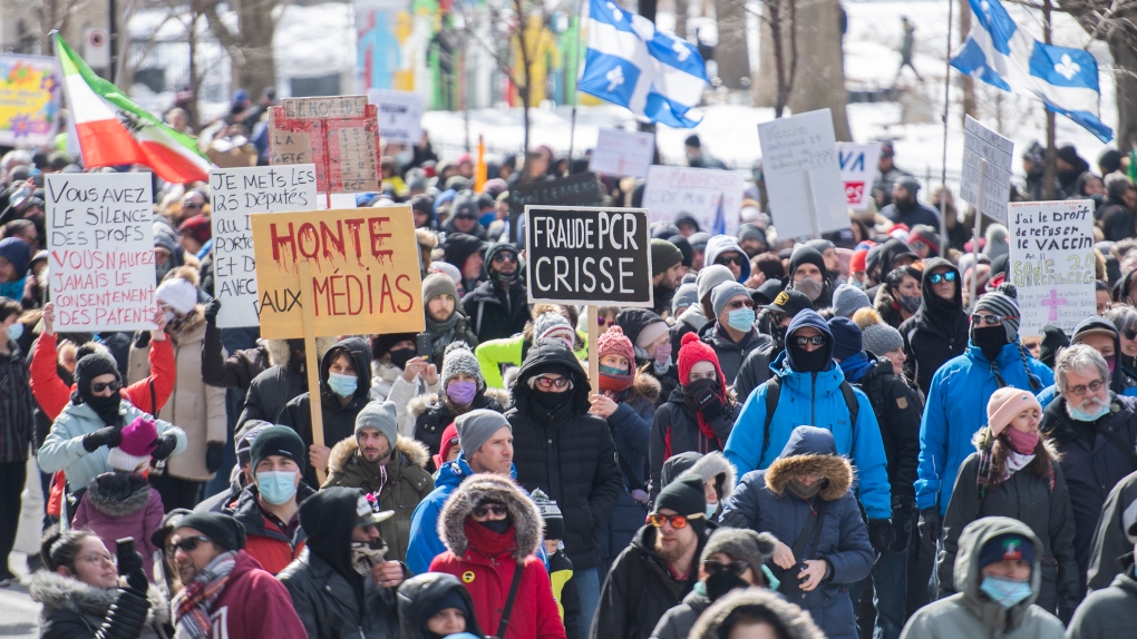 Сегодня днем тысячи людей собрались в центре Монреаля на марш протеста против пандемических мер общественного здравоохранения Квебека.