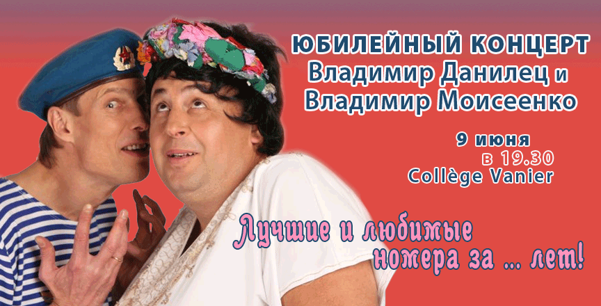 Зрители всегда с нетерпением ожидают концерты этого эксцентричного и невероятно смешного дуэта. Яркие образы и неподражаемая мимика заставят вас смеяться все два часа, и вы надолго сохраните хорошее настроение. 09 июня в 19.30 в Collège Vanier зажигательный дуэт представит давно полюбившиеся, хорошо известные хиты, а также свои новые номера.