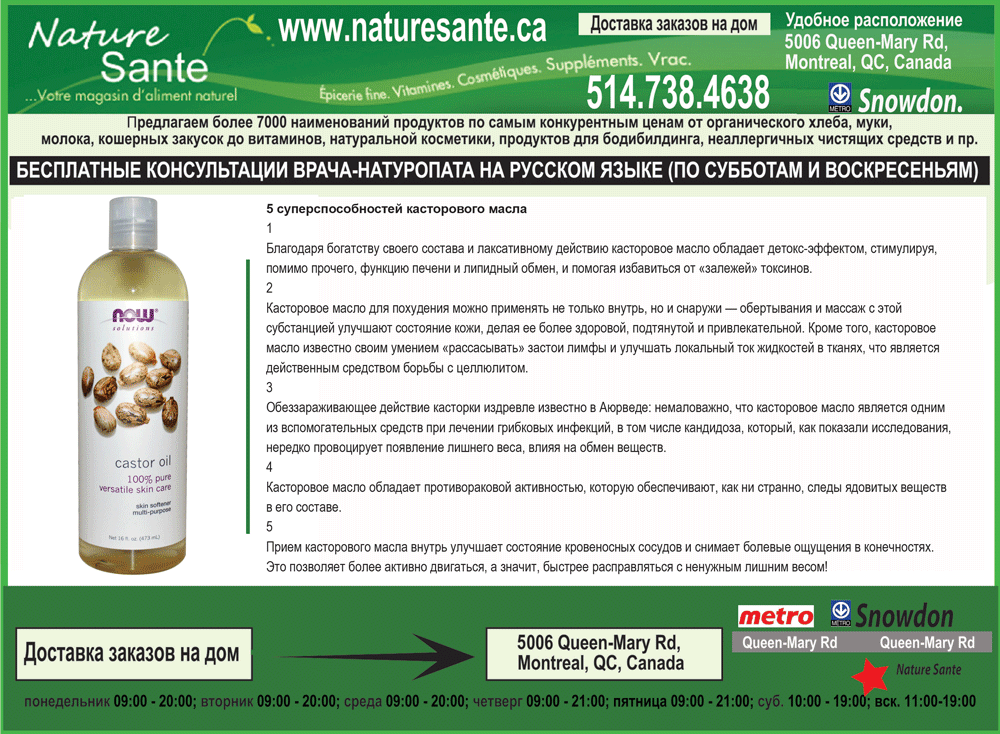 4 Касторовое масло обладает противораковой активностью, которую обеспечивают, как ни странно, следы ядовитых веществ в его составе. 5 Прием касторового масла внутрь улучшает состояние кровеносных сосудов и снимает болевые ощущения в конечностях. Это позволяет более активно двигаться, а значит, быстрее расправляться с ненужным лишним весом!