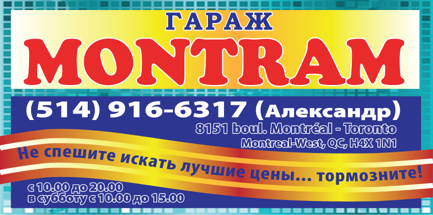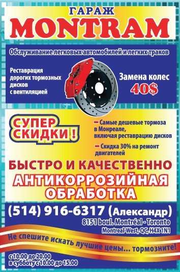 РекламаТранспорт, автомобили, самолёты, кораблиНе спешите искать лучшие цены… тормозните! Гараж Montram! by Svitlana MatviyenkoСен 12, 2018Сен 7, 201800 Share0 Обслуживание легковых автомобилей и легких траков. Реставрация дорогих тормозных дисков с вентиляцией Замена колес от 40 $ БЫСТРО И КАЧЕСТВЕННО! 8151 boul. Montréal – Toronto, H4X 1N1 514-916-6317 Александр Пожалуйста, оставьте это поле пустым. Подпишитесь на ежедневную рассылку новостей о Канаде, Квебеке и Монреале. Читайте актуальные новости каждый день. Не пропустите главные события! Проверьте ваш почтовый ящик или спам, чтобы подтвердить свою подписку.