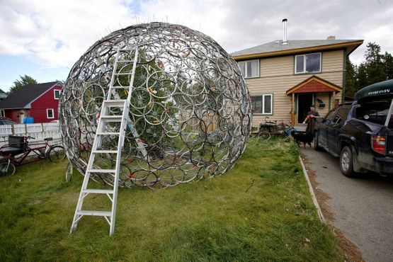 Поехали дальше! Хотя наш с вами Монреаль уже практически считается велогородом, тем не менее, купол из велосипедных колес находится совсем не у нас. А как раз очень от нас далеко, в городе Уайтхорс в Юконе. Там велосипедных дорожек еще больше, чем у нас, поэтому именно он подходящим местом для огромного купола, сделанного из велосипедных дисков. Да-да, абсолютно настоящих реальных ведосипедных дисков! Дело было так. Филипп ЛеБлонд, любитель велосипедов, художник и механик, создал это произведение искусства из запасных частей от своего любимого транспортного средства. Колеса различных размеров скрепляются вместе пластиковыми хомутами, создавая сферическую структуру, достаточно прочную, чтобы стоять на ней. А одиночный обод, лишенный спиц, обеспечивает доступ внутрь конструкции, где растет большая береза. Так что не только красота и необычность, а еще и такая вот польза от этой неповторимой конструкции. Справедливости ради стоит сказать, что это не первый купол ЛеБлонда. Он начал создавать гигантские изогнутые конструкции еще в 2004 году. Но данный купол, диаметром почти 5 м, несомненно является самым большим в его коллекции. Он занимает большую часть переднего двора художника и почти такой же высокий, как и его дом. Сбор материала, который он использовал для строительства купола, был самым простым делом. ЛеБлонд в прошлом владел магазином велосипедов, в котором он собирал колеса, диски и других детали в течение многих лет. Насобирав нужное количество колес, человек создал такой неповторимый купол. Шедевр, да и только!