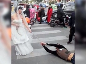 В Сети появилось видео, на котором разгневанная жительница Китая в подвенечном платье тащит по улице за цепь мужчину, который предположительно является ее женихом.