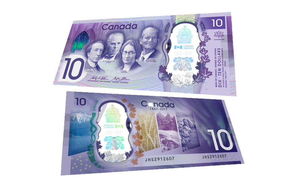 В честь 150-летия Конфедерации Банк Канады выпустил в обращение памятную купюру достоинством 10 долларов, которую, начиная с 1 июня, можно получить в банковских учреждениях. Как подчеркнули в Банке Канады, купюра, без колебаний, может быть названа самой защищенной в истории, имея в виду новые элементы защиты от подделок, которые «легко проверить, но трудно воспроизвести». Так, например, на банкноте можно найти изображение арки мемориальной Часовни Парламента, которое способно менять свой цвет, кленовые листья в трехмерном формате, а также элементы произведений искусства. Кроме того, новая купюра уникальна еще и потому, что на ней запечатлены изображения четырех ярких личностей, оставивших свой след в истории Канады, тогда как обычно на банкнотах размещают портрет только одного человека. Сэр Джон А.Макдональд – первый премьер-министр Канады,  Жорж-Этьен Картье – один из Отцов Конфедерации, Агнес Макфэйл  — первая женщина, избранная в Палату общин Канады, и Джеймс Глэдстоун – первый сенатор с индейскими корнями —  изображения именно этих четырех парламентариев, сыгравших значительную роль в истории Канады, появились на новой купюре. Надо сказать, что памятные банкноты появляются нечасто: за 82 года это происходило всего три раза, выпуск 2017 года стал четвертым. Всего 1 июня в обращение было выпущено 40 миллионов новых банкнот.
