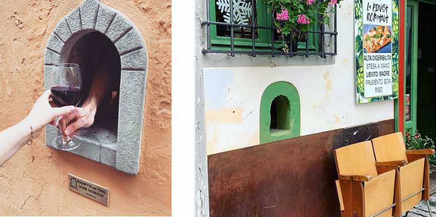 Сегодня в Италии через «винные окна» можно купить не только вино и алкогольные коктейли, а ещё и кофе, мороженное, фрукты и другие вкусности.