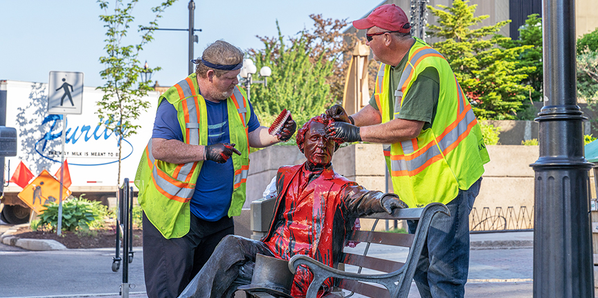 [box type=»shadow» align=»aligncenter» class=»» width=»»]В ночь с 18 на 19 июня в Шарлоттауне (Остров Принца Эдуарда) неизвестные облили красной краской памятник Джону МакДональду.[/box]