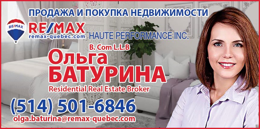 НедвижимостьРекламаОльга Батурина. Residential Real Estate Broker. by Svitlana MatviyenkoМар 29, 2020Мар 29, 202001 Share0 ■ ПРОДАЖА И ПОКУПКА НЕДВИЖИМОСТИ ■ ПОМОЩЬ В ПОЛУЧЕНИИ ССУДЫ ■ ИНВЕСТИЦИИ, БАНКОВСКАЯ НЕДВИЖИМОСТЬ REMAX Haute Performance Residential Real Estate Broker Ольга Батурина B. Com L.L.B. 514.501-6846 [email protected] Пожалуйста, оставьте это поле пустым. Подпишитесь на ежедневную рассылку новостей о Канаде, Квебеке и Монреале. Читайте актуальные новости каждый день. Не пропустите главные события! Проверьте ваш почтовый ящик или спам, чтобы подтвердить свою подписку.