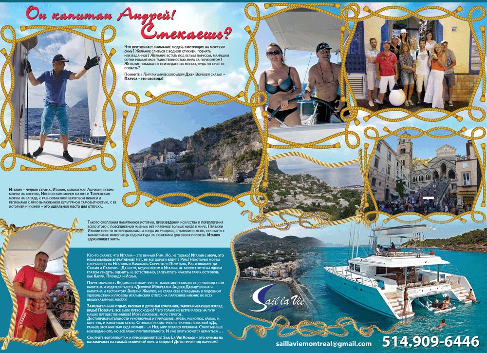 Парус окрыляет. Видимо поэтому группа наших монреальцев под руководством капитана и издателя газеты «Деловой Монреаль» Андрея Давыдушкина и капитана и ресторатора Валерия Жмурко, не стала себе отказывать в подобном удовольствии и провела итальянский отпуск на паруснике именно во всех вышеуказанных местах!