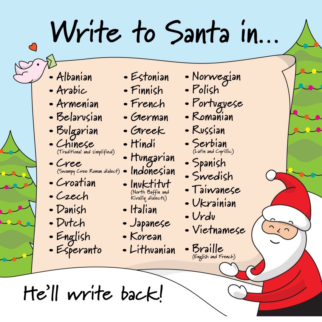 Почта Канады поделилась в своем официальном аккаунте в Instagram списком 38 языков, включая шрифт Брайля, на которые Санта мог готов в рамках программы написания писем корпорации.