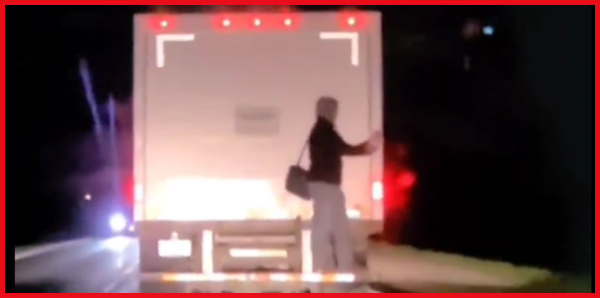 Полиция Онтарио опубликовала видео женщины, которая ехала, цепляясь за грузовик. На записи видно, как человек стоит на бампере автомобиля и держится за борт грузовика.