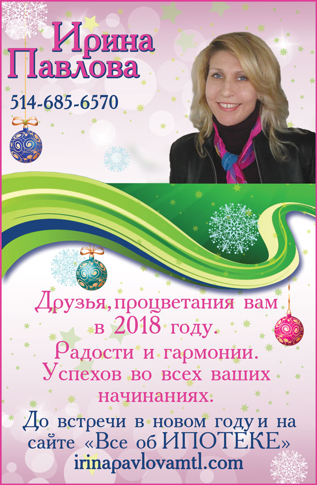 АвторыИрина ПавловаРекламаФинансыПоздравление с Новым Годом от Ирины Павловой, брокера по ипотеке. by Svitlana MatviyenkoЯнв 2, 2018Дек 28, 201700 Share0 Друзья, процветания вам в 2018 году. Радости и гармонии. Успехов во всех ваших начинаниях. До встречи в новом году и на сайте «Все об ИПОТЕКЕ». irinapavlovamtl.com Ирина Павлова 514-685-6570 Пожалуйста, оставьте это поле пустым. Подпишитесь на ежедневную рассылку новостей о Канаде, Квебеке и Монреале. Читайте актуальные новости каждый день. Не пропустите главные события! Проверьте ваш почтовый ящик или спам, чтобы подтвердить свою подписку.