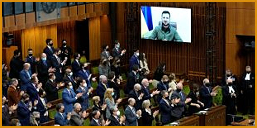 Незадолго до выступления Зеленского перед законодателями, Канада объявила о введении санкций в отношении еще 15 человек , которые, по словам федерального правительства, «позволили и поддержали выбор президента Путина вторгнуться в мирную и суверенную страну».