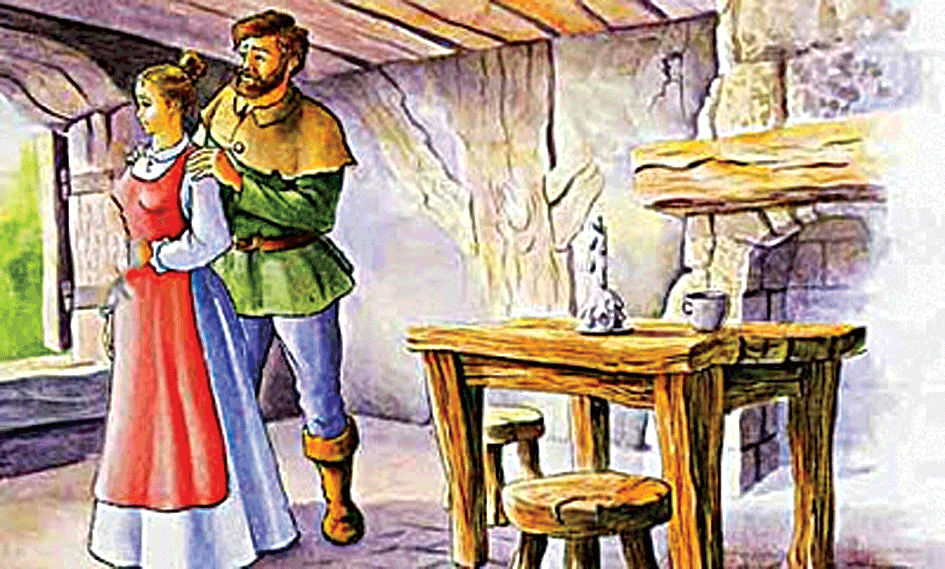 И вот она быстренько несет кувшин с водой, чтоб умыться, полотенце подает, за стол сажает. Дивится купец, но про себя думает, что это цирк при постороннем. Думает: «Побуду здесь подольше, она обязательно сорвется!» И вот сидят они за столом, жена крестьянина за ними ухаживает, вся светится от радости, а купец время от времени все разговор переводит на не проданный урожай, да как они зиму жить будут.