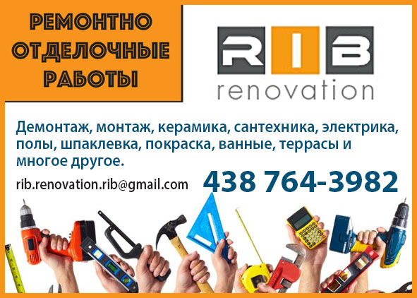 Демонтаж, монтаж, керамика, сантехника, электрика, полы, шпаклевка, покраска, ванные, террасы и многое другое. КАЧЕСТВО И СРОКИ ГАРАНТИРУЕМ! 438 764-3982 rib.renovation.rib@gmail.com