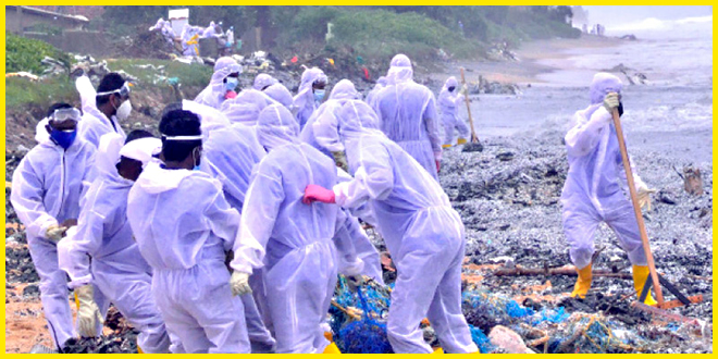 Военные, моряки и береговая охрана с помощью механических экскаваторов убирают с берегов тонны крошечных пластиковых гранул. Управление по защите морской среды Шри-Ланки заявляет, что это, возможно, самое сильное загрязнение пляжей в истории страны.