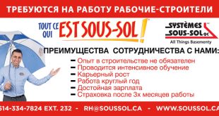 Преимущества сотрудничества с нами: — Опыт в строительстве не обязателен — Проводится интенсивное обучение — Карьерный рост — Работа круглый год — Достойная зарплата — Страховка после 3х месяцев работы [email protected] Info: 514-334-7824, ext. 232 www.soussol.ca. Поступите, как Петру, и постройте карьеру с нами! Я приехал в Канаду …