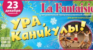 Ансамбль танца Фантазия представляет танцевальный театрализованный спектакль Ура, каникулы ! Вас ждет увлекательные приключения двух путешественников (на французском языке). Ну, а язык танца понятен всем!!!! Воскресенье 23 декабря, 16:00 salle Jacques Maurice ( в колледже Бребеф ) 5625 Decelles, Montréal Билеты онлайн : от 20 $ до 30 $ http://lavieenmouvement.com. И еще много всего интересного: …